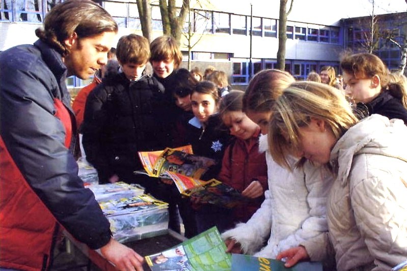 Ab 2003 waren es Bildungsprojekte, die Jörg und Frank Mertens in enger Zusammenarbeit mit deutschen und österreichischen Kultusministerien ausübten. 2004 bauten Frank und Jörg auf der Frankfurter Buchmesse ein Klassenzimmer auf. Zahlreiche Schulklassen mit Lehrern förderten ihre Schützlinge mit der selbst entwickelten Lern,- und Schreib-Software. Aber auch ältere Menschen aus Altersheimen folgten unseren Einladungen. Ziel war es, die Erzählungen der älteren Generation für die jüngere Generation festzuhalten. Jung und Alt zu verbinden, das stand ganz oben auf unserer Agenda! Es entstanden Schul,- und Klassenbücher, die online zu den Druckmaschinen des Bertelsmann-Verlages gesandt werden konnten. 2006 entwickelte Frank Mertens sein Soolheft, das in Deutschland und Österreich auf großes Interesse traf.